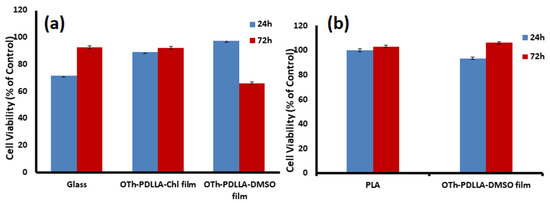 In vitro cell viability of NHGF seeded on OTh-PDLLA films obtained from its dispersion at c = 10 mg/mL deposited on glass (a) and PLA film (b).