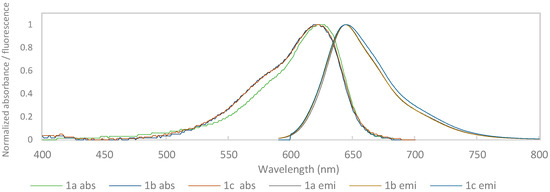 The normalized absorption and emission spectra of the benzo[a]phenoxazinium chlorides 1a–c in ethanol and water are shown in Figure 1 and Figure 2, respectively.