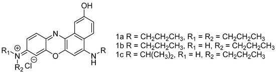 Benzo[a]phenoxazinium chlorides 1a–c were evaluated to determine their antifungal activity against Saccharomyces cereviseae PYCC 4072. The minimum concentration of each compound at which the yeast growth was inhibited by ≥80%, denoted as the Minimum Inhibitory Concentration (MIC) value, was superior to 200 µM for all the compounds. These results suggest that the hydroxyl group in position 2 of the polycyclic system decreases the potential antifungal activity of benzo[a]phenoxazines, since the presence of (di)propyl groups in the amines at positions 5 and 9 of the polycyclic system when this hydroxyl group is not present is usually associated with low MIC values [7,13]. This fact stands out in the non-hydroxylated benzo[a]phenoxazinium chloride analogous to compound 1a, with an MIC value of 1.56 [7]. However, the effect of the hydroxyl group on the antifungal activity of benzophenoxazine derivatives needs to be further evaluated with a higher number of compounds to draw conclusions about the structure–activity relationship.