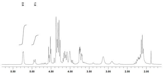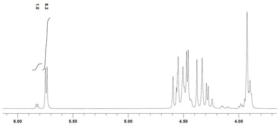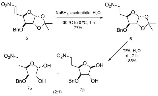 This mixture was characterized on the basis of its spectroscopic properties. Thus, its 1H NMR spectrum shows, among others, four signals at 71.5, 71.7, 77.5, and 78.5 ppm, corresponding to the two methylene groups of each of the epimers that make up the mixture. The IR spectrum shows two bands at 1554 and 1377 cm−1, characteristic of the nitro group. The 8:1 ratio at which the components of the 4a + 4b mixture were obtained, was easily established from its 1H NMR, in comparison to the relative intensities of the signals corresponding to their respective anomeric protons, which appear as two doublets at 5.74 ppm (J1,2 = 3.5 Hz) and at 5.82 ppm (J1,2 = 3.8 Hz), as can be seen in Figure 1.