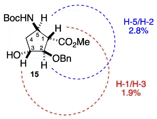 Thus, it was observed that H-1 shows NOE with H-3 (1.9%), which indicates that both protons are on the same face of the cyclopentane ring, allowing the configuration at the C-1 position to be established. Furthermore, H-5 presents NOE with H-2 (2.8%), which is only possible if both protons are arranged on the same side of the cyclopentane ring, which determines the configuration of the C-5 position.