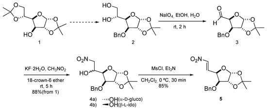 According to our working plan, the transformation of diacetone-α-D-glucose (1) into nitroolefin 5 was carried out following a procedure described in the literature (Scheme 1) [9].