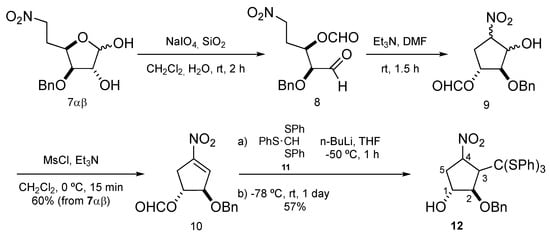 By adding n-butyllithium to a solution of tris(phenylthio)methane (11) in tetrahydrofuran, the corresponding lithium salt was obtained, to which the previously prepared nitroolefin 10 was then added. Compound 12 was thus obtained as the sole product, in a 57% yield. As shown, under the reaction conditions the introduction of the tris(phenylthio)methane group was accompanied by the deprotection of the formyloxy group. The characterization of derivative 12 was made on the basis of its spectroscopic properties, including the presence in its 1H NMR spectrum of two multiplets between 7.16 and 7.50 ppm, due to twenty aromatic protons [five protons corresponding to the benzyloxy group and fifteen protons corresponding to the three phenyls of the tris(phenylthio)methane group], as well as the presence of a double triplet at 5.29 ppm (J4,3 = J4,5 = 4.1 Hz, J4,5′ = 8.2 Hz), corresponding to the -CH- contiguous to the nitro group. Its 13C NMR spectrum shows, among others, a signal at 58.1 ppm, corresponding to the -CH- linked to the tris(phenylthio)methane group, as well as a signal at 77.5 ppm, corresponding to the quaternary carbon of the newly introduced tris(phenylthio)methane group. A comparison of the spectra of 10 and 12 showed the absence of any signal corresponding to the formyloxy group of the starting 10.