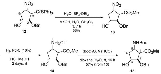 We continued our work on the synthesis of polyhydroxylated cyclopentane β-amino acids by catalytically hydrogenating nitro ester 13 in the presence of hydrochloric acid, which led to the reduction in its nitro group to amino (Scheme 4). The resulting compound 14 was directly treated with tert-butoxycarbonyl anhydride in basic medium, giving the β-amino ester 15 in a 57% yield for the two steps.