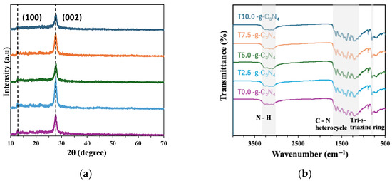 The crystal structures of pristine and modified g-C3N4 catalysts were investigated using X-ray diffraction (XRD) analysis. As shown in Figure 1a, all photocatalysts exhibited two characteristic diffraction peaks at 12.8° (the in-plane structural repetition of tri-s-triazine units) and 27.7° (the interlayer stacking of aromatic conjugated systems), corresponding to the (100) and (002) planes of g-C3N4, respectively (JCPDS No. 87–1526) [9]. The diffraction peak at 12.8° progressively weakened with increasing THB doping content. This decline suggests a disruption in the in-plane ordering of triazine units, indicating that the planar structure has become more disordered due to the modification.