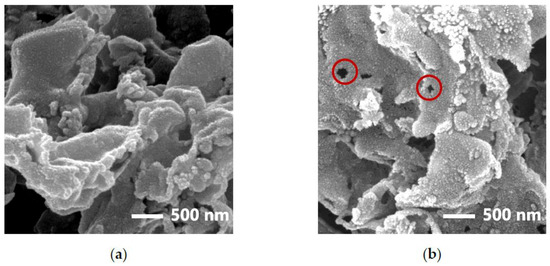 SEM images of (a) T0.0-g-C3N4(g-C3N4), (b) T7.5-g-C3N4; the red circles: nanoscale pores.