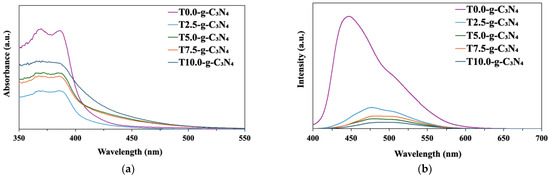 UV-visible DRS was employed to investigate the optical absorption properties and band structure of synthesized catalysts. As shown in Figure 3a, unmodified catalyst has strong adsorption in the ultraviolet region and adsorption edge at 420 nm of wavelength. With the increase in THB doping content, the adsorption edge of modified g-C3N4 was red shifted. Notably, the absorption edge of T7.5-g-C3N4 extended to approximately 460 nm. In addition, the modified catalysts exhibited a distinct two-step visible light absorption behavior, indicating a successful extension of the light response range because of THB-induced structural modification. The acquired diffuse reflectance spectra were converted using the Kubelka–Munk transformation to calculate the band gap via a Taucplot analysis (Figure S2). The π–π*-derived bandgaps were as follows: T0.0-g-C3N4; 2.94 eV, T2.5-g-C3N4; 2.81 eV, T5.0-g-C3N4; 2.77 eV, T7.5-g-C3N4; 2.78 eV and T10.0-g-C3N4; 2.70 eV. In contrast, the modified g-C3N4 exhibited an intermediate band derived from n–π⁎ transitions, and the corresponding band gaps were as follows [11]: T5.0-g-C3N4; 2.26 eV, T7.5-g-C3N4; 2.23 eV and T10.0-g-C3N4; 2.27 eV. In addition, the valence band positions of T0.0-g-C3N4 and T7.5-g-C3N4 were determined by valence band X-ray photoelectron spectroscopy (VBXPS) to be 1.87 eV and 1.56 eV vs. NHE, respectively. Using these values and the corresponding band gaps, the conduction band positions were calculated to be −1.07 eV for T0.0-g-C3N4 and −1.22 eV for T7.5-g-C3N4.