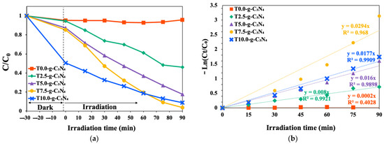 Figure 5a shows the effect of EDTA solution concentration on the photocatalytic reduction of Cr(VI) by T7.5-g-C3N4. The reduction rate reached a maximum at an EDTA concentration of 300 ppm, while the reduction efficiency decreased at 500 ppm and 700 ppm. Since the theoretical consumption of EDTA is estimated to be less than 1% of the added amount, this decrease is unlikely to be due to EDTA depletion. Possible explanations include the excessive EDTA covering the catalyst surface, thereby inhibiting the adsorption of Cr(VI) onto active sites, or the scavenging of reactive species such as superoxide radicals. Although further experiments are necessary to clarify the detailed mechanism, the optimal EDTA concentration was determined to be 300 ppm in this study.
