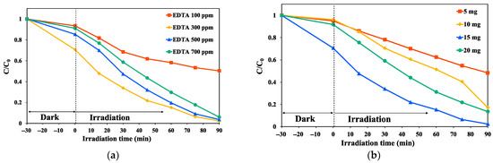 Effect of (a) EDTA concentration and (b) catalyst amount on the reduction in Cr(VI).