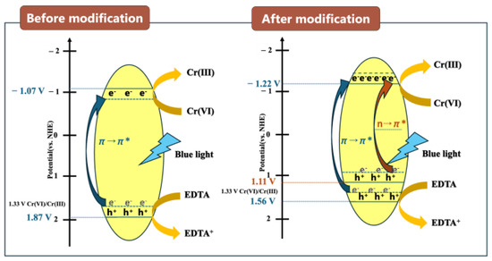 The possible mechanisms for the photocatalytic reduction of Cr(VI) by the catalysts before and after modification in this study are illustrated in Figure 6. For the unmodified catalyst, the photocatalytic reduction mechanism follows the typical process. Upon visible light irradiation, electrons in the valence band (VB) are excited to the conduction band (CB). The electrons accumulated in the CB can readily reduce Cr(VI) to Cr(III), since the reduction edge potential of Cr6+/Cr3+ [E0 (Cr6+/Cr3+) = +1.33 V versus NHE] is appropriately positioned [13]. The fact that electrons are the active species in this reaction is supported by the radical scavenger experiment shown in Figure S3, where the addition of K2S2O8, an electron scavenger, led to a decrease in the Cr(VI) reduction rate [14]. For the modified catalyst, in addition to the above electron excitation, the electron transition within the intermediate band arising from the n–π* transition activated by the modification further promotes electron accumulation in the CB. Moreover, the increased porosity enhances carrier separation, further improving the reduction efficiency. The addition of EDTA traps holes in VB and promotes reduction on CB.