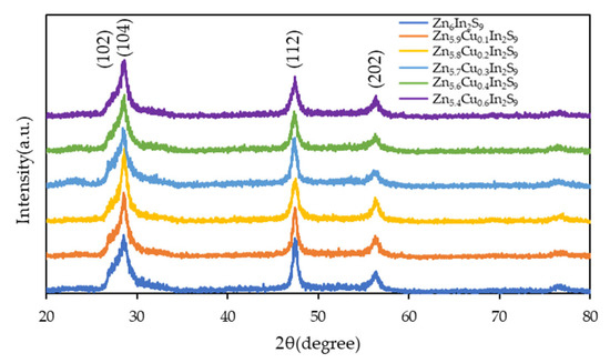 The crystallinity of Zn6In2S9 and Cu-doped Zn6In2S9 samples was investigated by X-ray diffraction (XRD). As shown in Figure 1, four characteristic diffraction peaks corresponding to indium zinc sulfide were observed for all catalysts, which can be indexed to the (102) and (104) planes at approximately 27.9°, the (112) plane at around 47.5°, and the (202) plane at approximately 56.5° [9,10]. The consistent presence of these diffractions in all samples indicates that Cu incorporation does not significantly alter the primary crystal structure of Zn6In2S9.