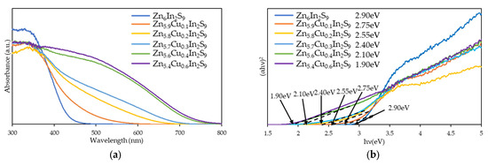 UV–visible diffuse reflectance spectroscopy (UV–vis DRS) was conducted to evaluate the optical absorption properties of all zinc indium sulfide photocatalysts (Figure 3) [12]. The results revealed that pristine zinc indium sulfide exhibited the shortest absorption edge, indicating a limited light absorption in the visible region. Upon Cu doping, a significant red-shift of the absorption edge was observed, with enhanced absorption extending beyond 500 nm. This expansion of the absorption region facilitates the generation of additional photogenerated electron–hole pairs, thereby enhancing the photocatalytic activity.