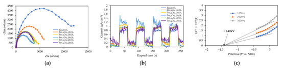 An electrochemical impedance spectroscopy (EIS) Nyquist plot is shown in Figure 4a. Compared with pristine zinc indium sulfide, the Zn5.7Cu0.3In2S9 sample exhibited a significantly smaller semicircle diameter, indicating improved charge carrier mobility and reduced electron transfer resistance [14]. Additionally, Zn5.7Cu0.3In2S9 demonstrated the highest photocurrent density (Figure 4b), suggesting efficient charge transfer. The Mott–Schottky plot for Zn5.7Cu0.3In2S9, shown in Figure 4c, exhibits a positive slope, confirming that it is an n-type semiconductor [15,16]. The flat band potential (EFB) of Zn5.7Cu0.3In2S9 was determined to be −1.45 V (vs. Ag/AgCl), and EFB (vs. NHE) = EFB (vs. Ag/AgCl) + 0.196 eV, the corresponding value was −1.25 V (vs. NHE). In n-type semiconductors, the conduction band (CB) is typically located approximately 0.1 eV below the flat band potential (EFB). Therefore, for Zn5.7Cu0.3In2S9, the CB is situated at −1.35 V. The valence band (VB) was calculated using the equation EBG = EVB − ECB. As a result, the VB was located 1.05 V.