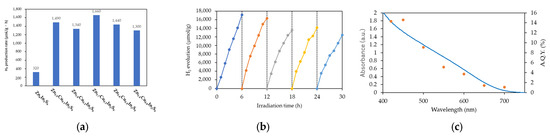 Figure 5c shows the wavelength-dependent apparent quantum yield (AQY) of Zn5.7Cu0.3In2S9. The action spectra were measured at specific wavelengths (420, 450, 500, 550, 600, 650, and 700 nm). These spectra exhibit a trend similar to that of the DRS absorption spectra, suggesting that hydrogen production is driven by the band excitation of the photocatalyst. A comparison of hydrogen production rate with those reported in previous studies is shown in Table S1 [11,17,18,19,20].