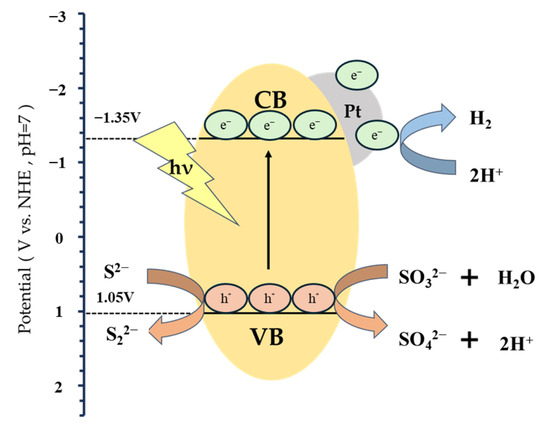 Finally, the energy band structure of Zn5.7Cu0.3In2S9, derived from the Tauc plot (Figure 3b) and Mott–Schottky plot (Figure 4c), along with the proposed reaction mechanism, are illustrated in Figure 6. Upon irradiation, electrons in the valence band were excited to the conduction band, generating photoinduced electrons and holes. The photoexcited holes efficiently oxidize sulfide (S2−) and sulfite (SO32−) ions, resulting in proton generation. Concurrently, the photoexcited electrons are transferred to sulfide and sulfite ions, effectively suppressing electron–hole recombination and enhancing charge separation. Additionally, the photoexcited electrons in the conduction band are transferred to platinum (Pt), where they reduce protons (H+) to generate hydrogen gas.
