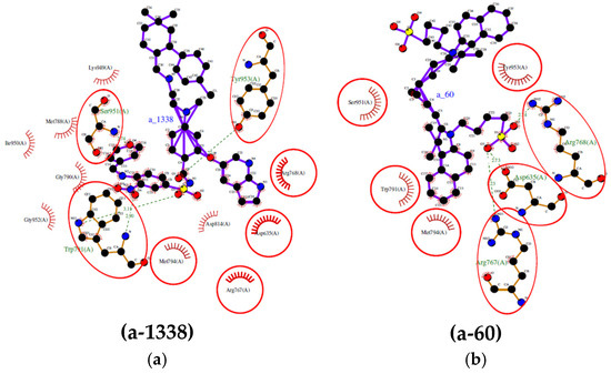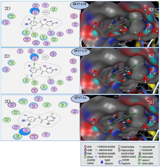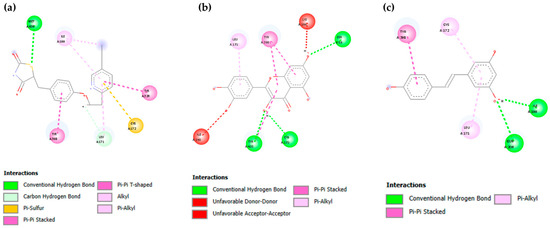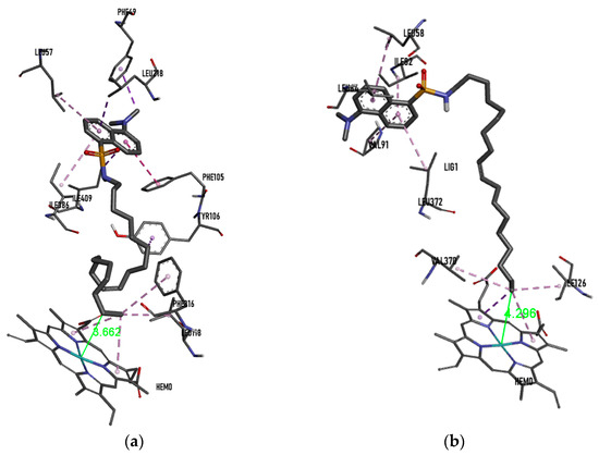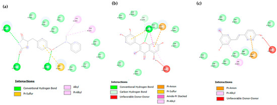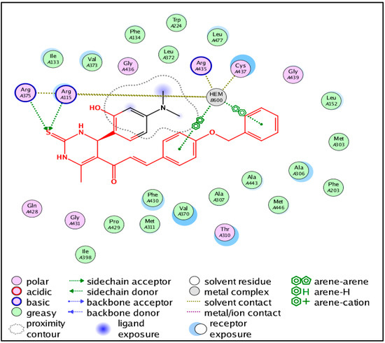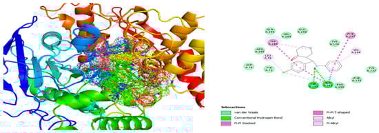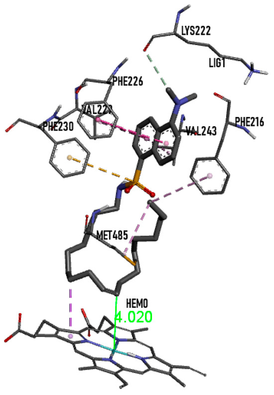 M. tuberculosis CYP51 revealed a strong binding affinity (−8.8 kcal/mol), stabilized by π–sulfur contacts with MET79 and PHE83, π–π stacking with TYR76, and π–π T-shaped interactions with PHE83 and the heme cofactor. Additional π–alkyl interactions with LEU321, ALA325, and the heme group reinforced hydrophobic complementarity, confirming efficient accommodation of