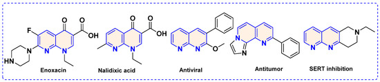 - Mithula, S.; Nandikolla, A.; Murugesan, S.; Kondapalli, V.G.C.S. 1,8-Naphthyridine Derivatives: An Updated Review on Recent Advancements of Their Myriad Biological Activities. Future Med. Chem. 2021, 13, 1591–1618. [Google Scholar] [CrossRef] [PubMed]