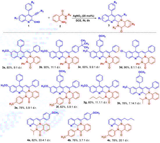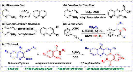 - Chahal, K.; Vani, D.; Pranay, K.; Madhu, I.; Sridhar, B.; Reddy, K.R. Silver Catalyzed Cascade Strategy for the Synthesis of Diversely Substituted Polycyclic Fused 1,7-Naphthyridine Scaffolds. ChemistrySelect 2023, 8, e202304260. [Google Scholar] [CrossRef]