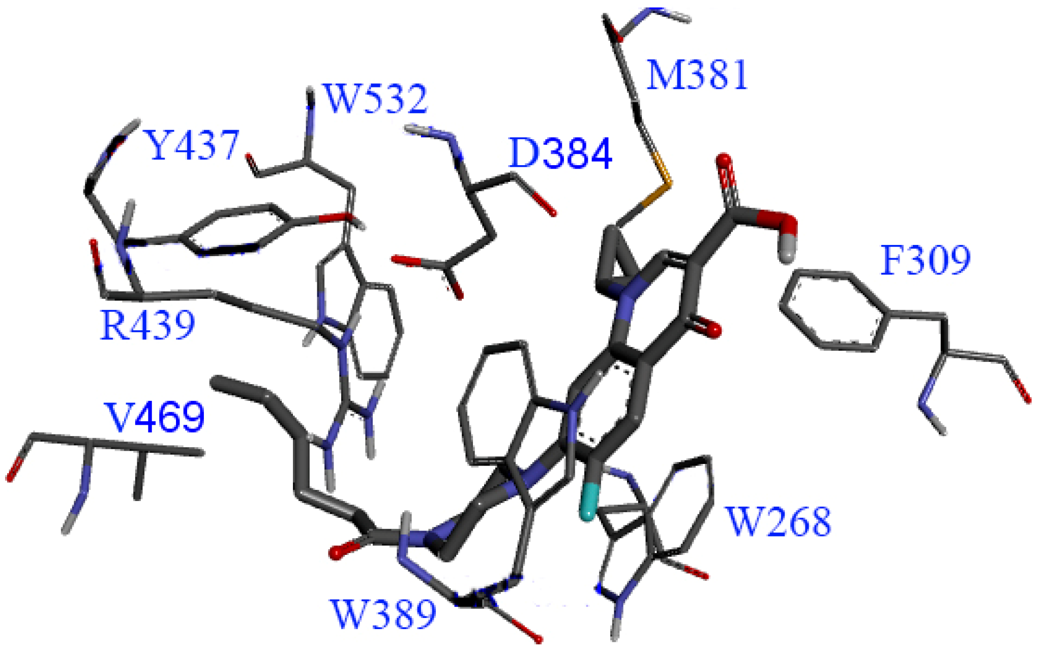 | 6jmn | −9 | Trp268, Asp384, Arg439, Phe309, Met381, Ala358, Tyr383, Ser357, Gly359, Lys362, Tyr411, Glu308, Trp532, Tyr437, Tyr156, Phe184, Asp306 |