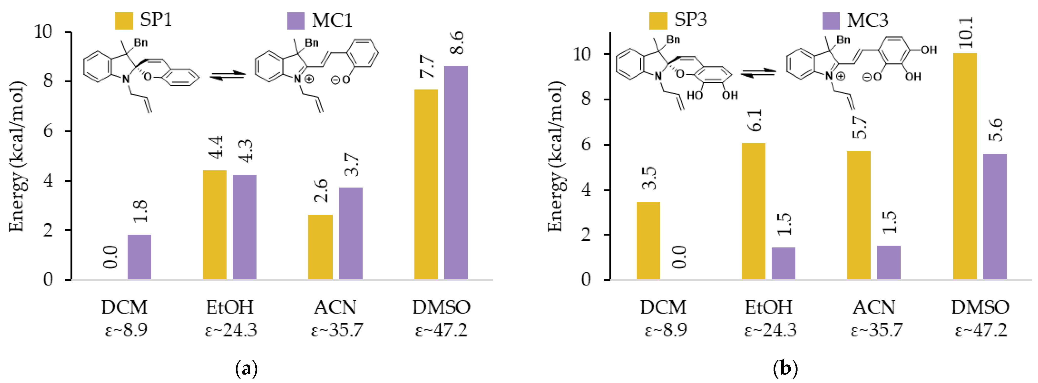 3.3. SP-MC Relative Stability and Solvents Effect