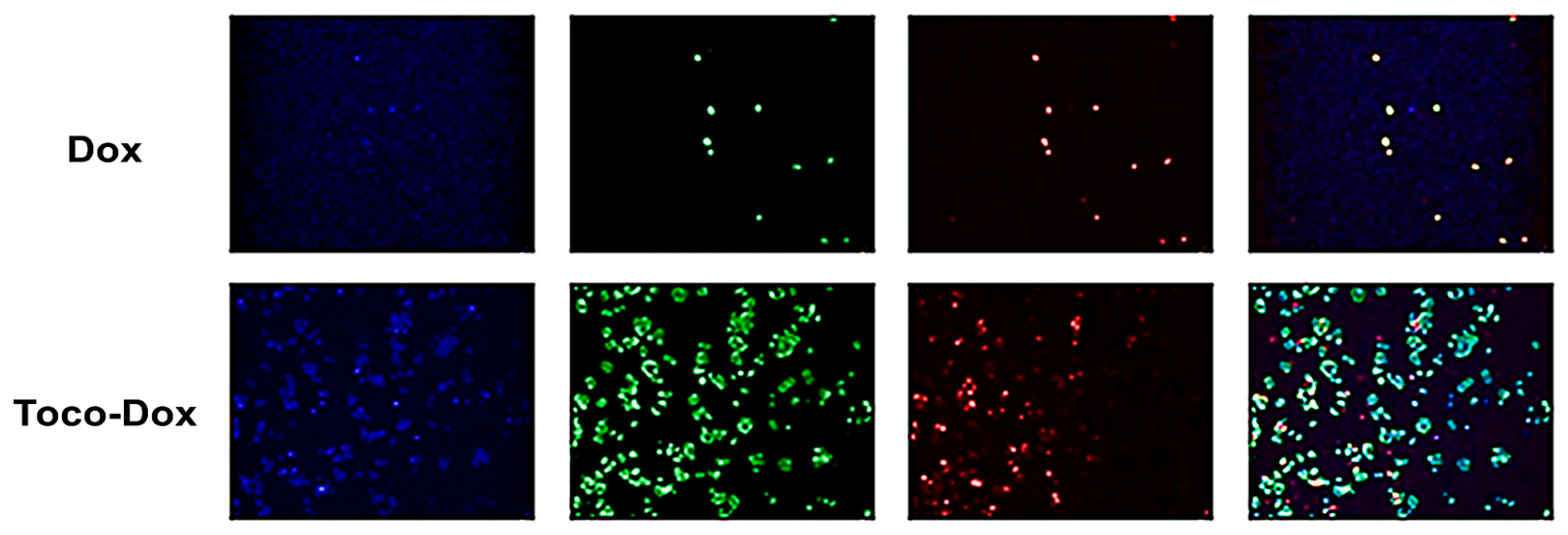3.5. In Vitro Cytotoxicity of Toco–Dox and Intracellular Localization