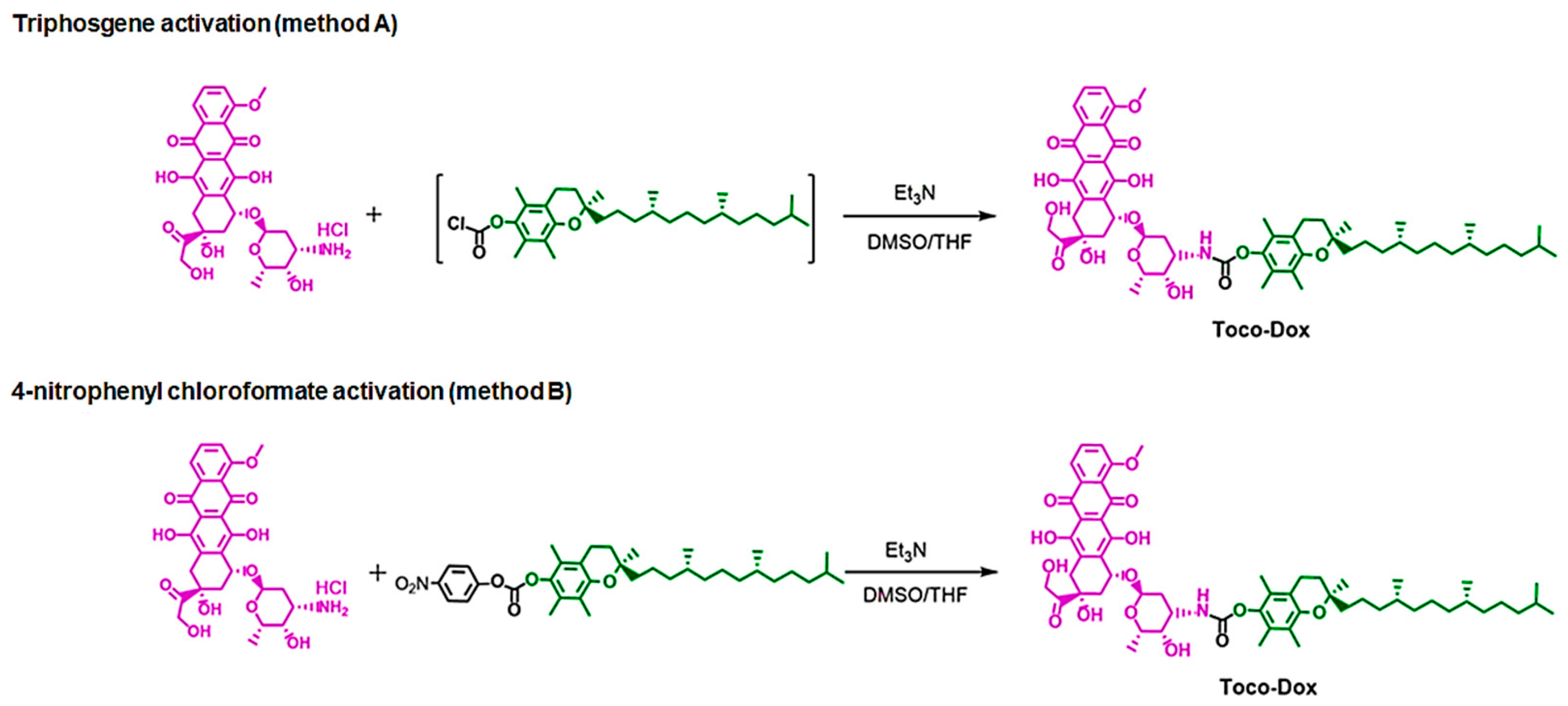 3.1. Synthesis of Toco–Dox via Triphosgene (Method A) and 4-Nitrophenyl Chloroformate (Method B) Activation
