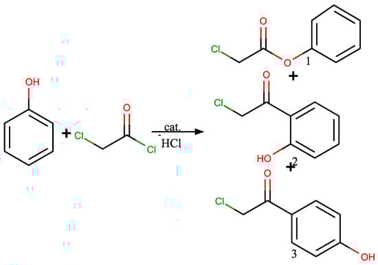 React ion of phenol with chloracetyl chloride in the presence of a catalyst: 1: phenyl 2-chloroacetate; 2: 2-chloro-1-(2-hydroxyphenyl)ethenone; 3: 2-chloro-1-(4-hydroxyphenyl)ethenone.