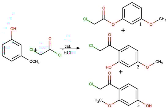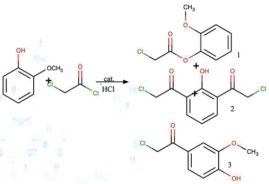 React ion of o-methoxyphenol with chloracetyl chloride in the presence of a catalyst: 1: 2-methoxyphenyl 2-chloroacetate; 2: 1,1′-(2-hydroxy-1,3-phenylene)bis(2-chloroethanone); 3: 2-chloro-1-(4-hydroxy-3-methoxyphenyl)ethenone.