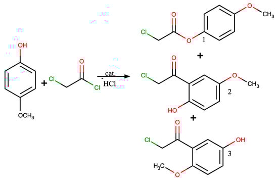 React ion of p-methoxyphenol with chloracetyl chloride in the presence of a catalyst: 1: 4-methoxyphenyl 2-chloroacetate; 2: 2-chloro-1-(2-hydroxy-5-methoxyphenyl)ethanone; 3: 2-chloro-1-(5-hydroxy-2-methoxyphenyl)ethanone.