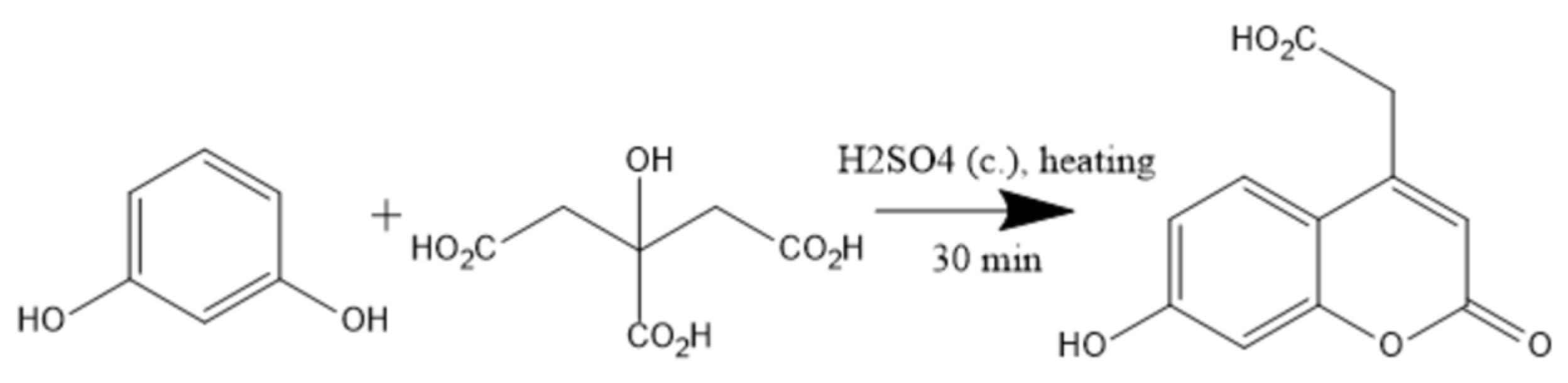 - Al Anshori, J.; Rahayu, D.S.; Hidayat, A.T.; Hidayat, I.W.; Zainuddin, A. Synthesis of fluorescent compound, 7-Hydroxy-4-methyl-2H-chroman-2-one via Pechmann condensation of citric acid and resorcinol. Res. J. Chem. Environ. 2018, 22, 91–96. [Google Scholar]