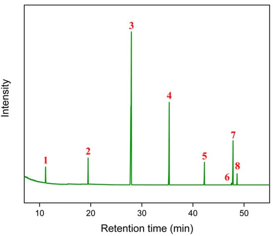 The results obtained allowed, through the comparison of retention times with the Mix C4–C24 standards, the complete identification of the fatty acids present in the fixed licuri oil, as presented in the following table (Table 1).