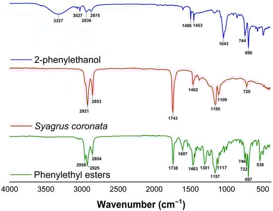 The spectrum of 2-phenylethanol (blue line) exhibits a broad band at 3327 cm−1, attributed to the axial vibration of the hydroxyl group. The disappearance of this band in the product spectrum (green line) indicates the consumption of alcohol in the esterification reaction. From this perspective, it is noteworthy that no bands corresponding to hydroxyl groups (3200–3600 cm−1) were observed in the FTIR spectrum of Syagrus coronata, indicating the absence of free fatty acids and confirming that they are predominantly present in the form of triacylglycerides.