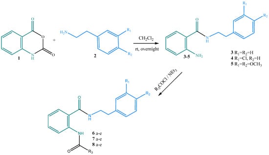 Synthetic procedure for obtaining the desired hybrid diamides 6–8 a–e with anthranilic acid (green) and phenylethylamine (blue) structural units.