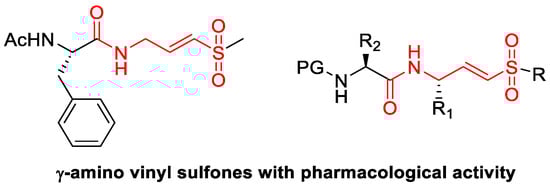 Vinylsulfones and gamma-amino vinylsulfones (Figure 1) are compounds known for their varied pharmacological activity, such as being reversible inhibitors of many types of cysteine proteases, inhibiting other types of enzymes such as HIV-1 integrase and antibacterial agents, among others [4,5].