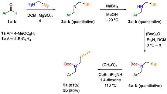 According to our working plan, the preparation of allenyl carbamates 5 was carried out following a procedure described in the literature (Scheme 1) [8]. Thus, alkynyl carbamates 1a–b were prepared through reductive amination of the appropriate aromatic aldehyde and propargylamine in the presence of anhydrous magnesium sulfate, which acts as a dehydrating agent. The treatment of the corresponding N-substituted prop-2-yn-1-amines with Boc2O afforded the desired compounds with good yields. Finally, the terminal alkynes 4 were conveniently converted into allenic carbamates 5 by treatment with paraformaldehyde in the presence of diisopropylamine and copper(I) bromide (Crabbé homologation reaction).