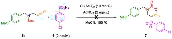 Next, when starting materials were synthesized, the study of the cyclization/sulfonylation cascade reaction for obtaining sulfonated oxazinones was developed. The allenyl carbamate 5a was used as model substrate. The reaction conditions, previously optimized by the research group for cyclization reactions with incorporation of the arylsulfonyl group, were tested (2 equivalents of sodium sulfinate 6a, 2 equivalents of silver nitrate as the oxidizing agent, and copper(II) acetate as the catalyst) [9]. The solvent used was acetonitrile, and the reaction was achieved in a sealed tube at 100 °C (Scheme 2). However, after purifying the product and obtaining its 1H-NMR spectrum, it did not correspond to the sulfonated oxazinone 7.
