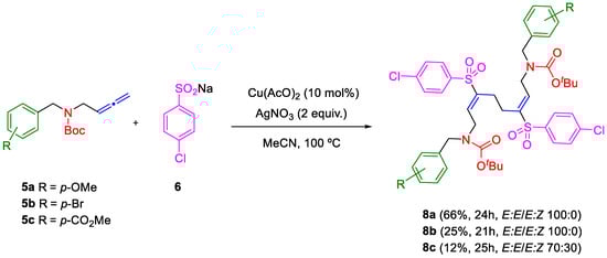 The scope of the copper-catalyzed sulfonylation/homodimerization of allenyl carbamates was explored. Allenyl carbamates 5a–c with electron-donating (MeO), moderately electron-withdrawing (Br) or electron-withdrawing (CO2Me) substituents at para position of the phenyl ring and sulfinate 6 provided the required homodimeric γ-amino vinyl sulfones 8 in fair yields (Scheme 3).