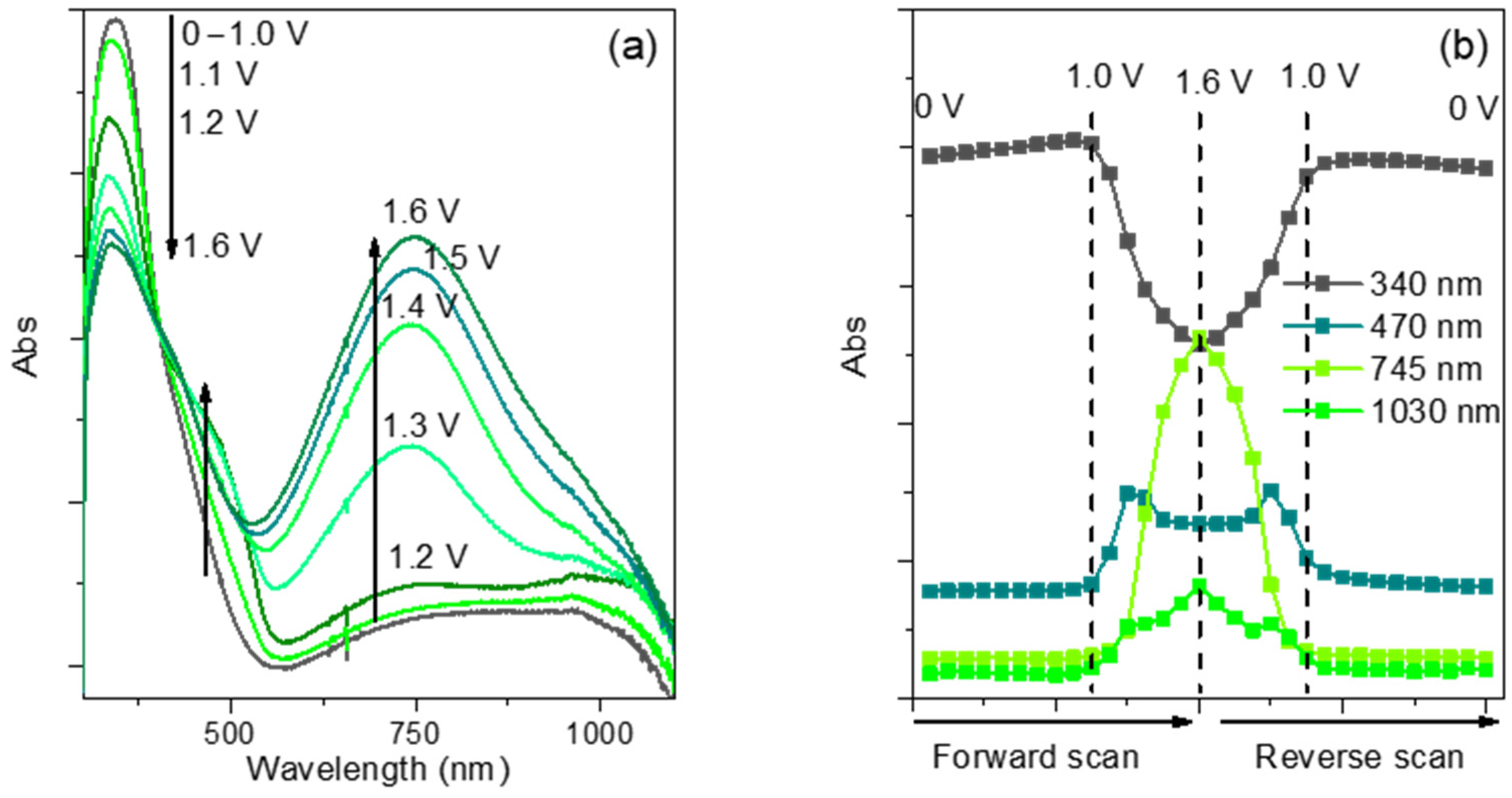 3.4. Spectroelectrochemical Characterization of Film