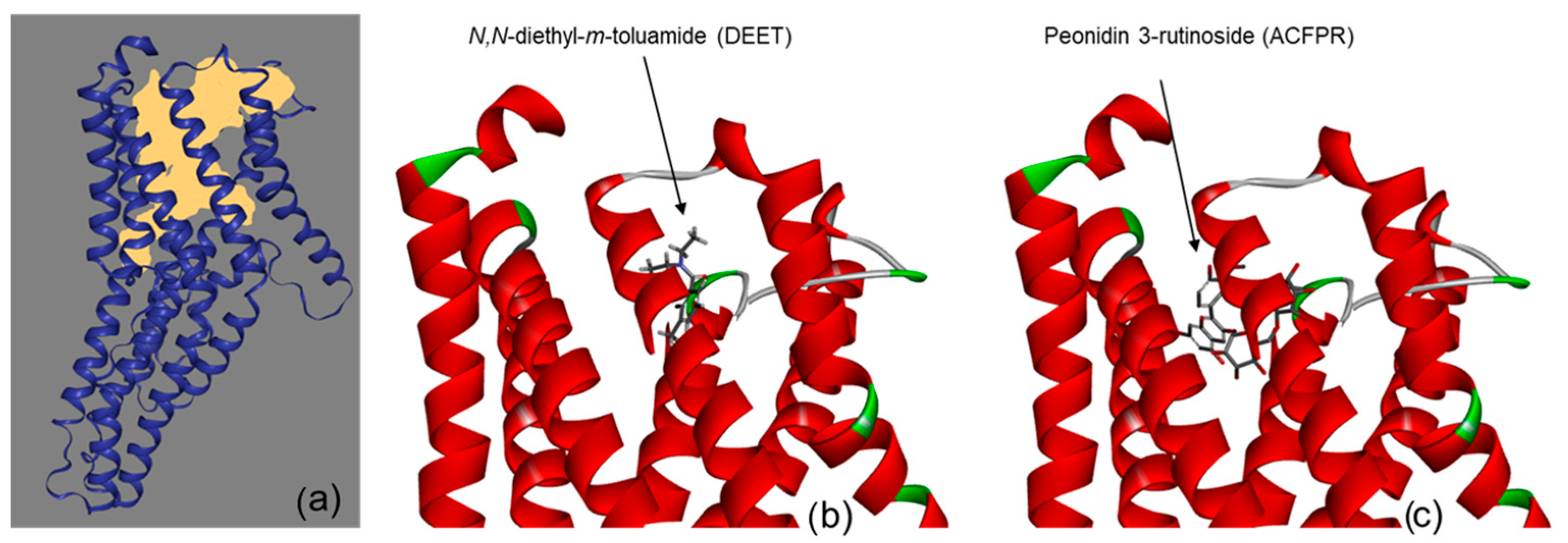 - Renthal, R. Arthropod Repellent Interactions with Olfactory Receptors and Ionotropic Receptors Analyzed by Molecular Modeling. Curr. Res. Insect Sci. 2024, 5, 100082. [Google Scholar] [CrossRef]