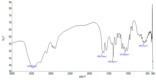 The FTIR spectrum of chitosan was recorded using a PerkinElmer Spectrum Two spectrometer over the wavenumber range 4000–400 cm−1 at the Laboratory of Inorganic and Environmental Chemistry, University of Tlemcen (Algeria). The samples were prepared in the form of KBr pellets by thoroughly mixing approximately 1 mg of finely powdered chitosan with 100 mg of dry spectroscopic-grade KBr. The mixture was then compressed into a transparent pellet using a hydraulic press. The resulting discs were placed in the sample holder for spectral acquisition. The obtained spectrum is presented in Figure 1, and the corresponding band assignments are summarized in Table 1.