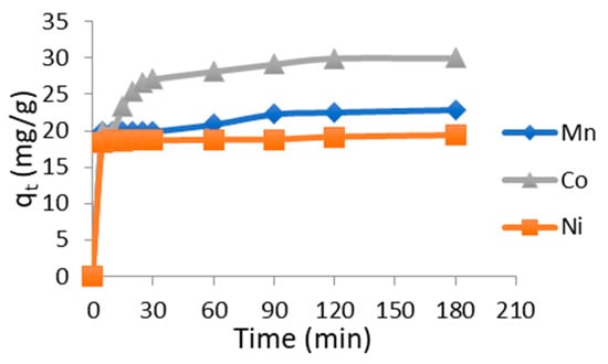 At equilibrium, chitosan showed a higher affinity toward Co(II), followed by Mn(II), and then Ni(II). The equilibrium contact time was the same for all three metals, approximately 180 min. The maximum adsorption capacities reached 30 mg/g for Co(II), 22.91 mg/g for Mn(II), and 19.38 mg/g for Ni(II), confirming the preferential adsorption order Co(II) > Mn(II) > Ni(II).