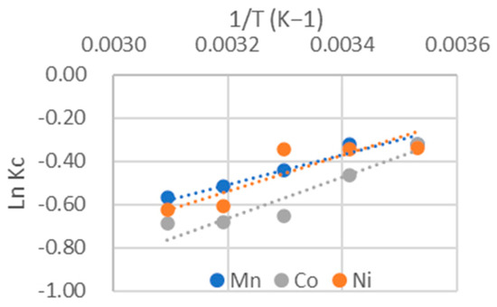The adsorption heats of the different heavy metals onto chitosan are determined in Figure 8, which represent the plots of ln Kc versus 1/T, where the temperature is expressed in Kelvin. ΔH was obtained from the slope, while ΔS was calculated from the intercept. All the results are listed in Table 5 and Table 6.