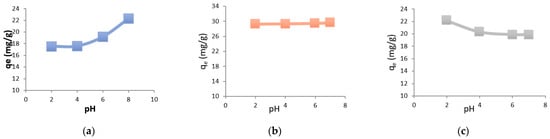 The amount of metals adsorbed at equilibrium as a function of pH (a) Mn, (b) Ni, (c) Co. Csolution = 100 mg/L; Vsolution = 300 mL, mchitosan = 1 g; temperature = ambient; stirring speed = medium.