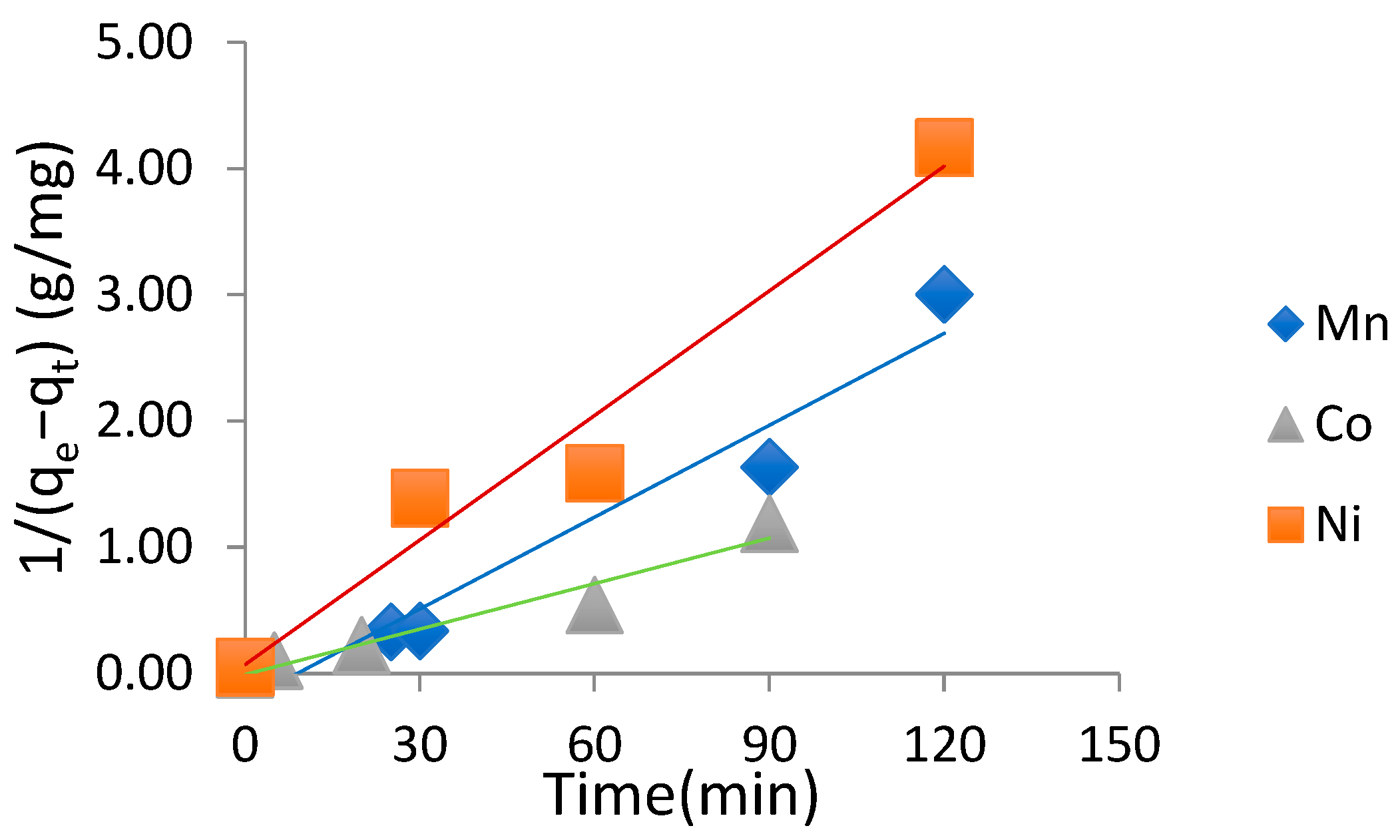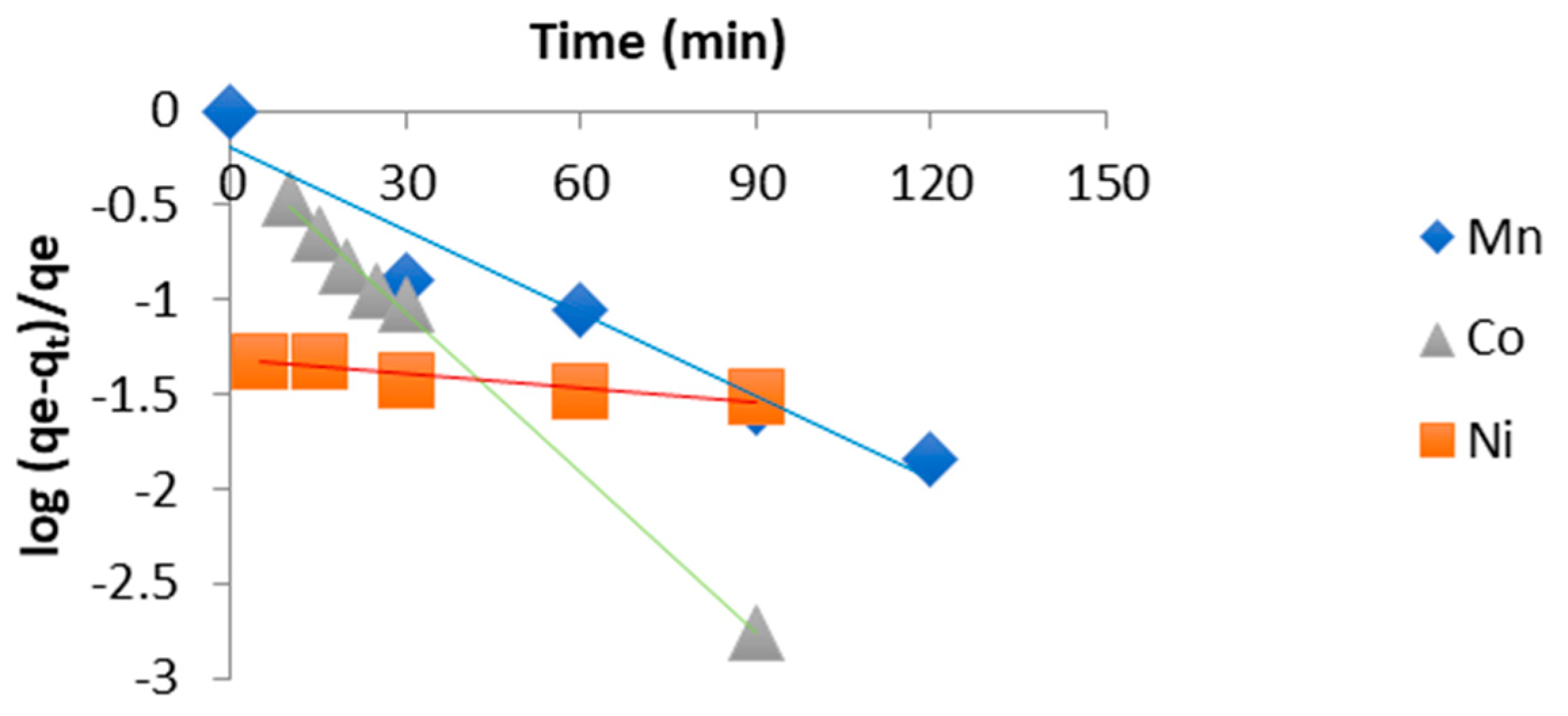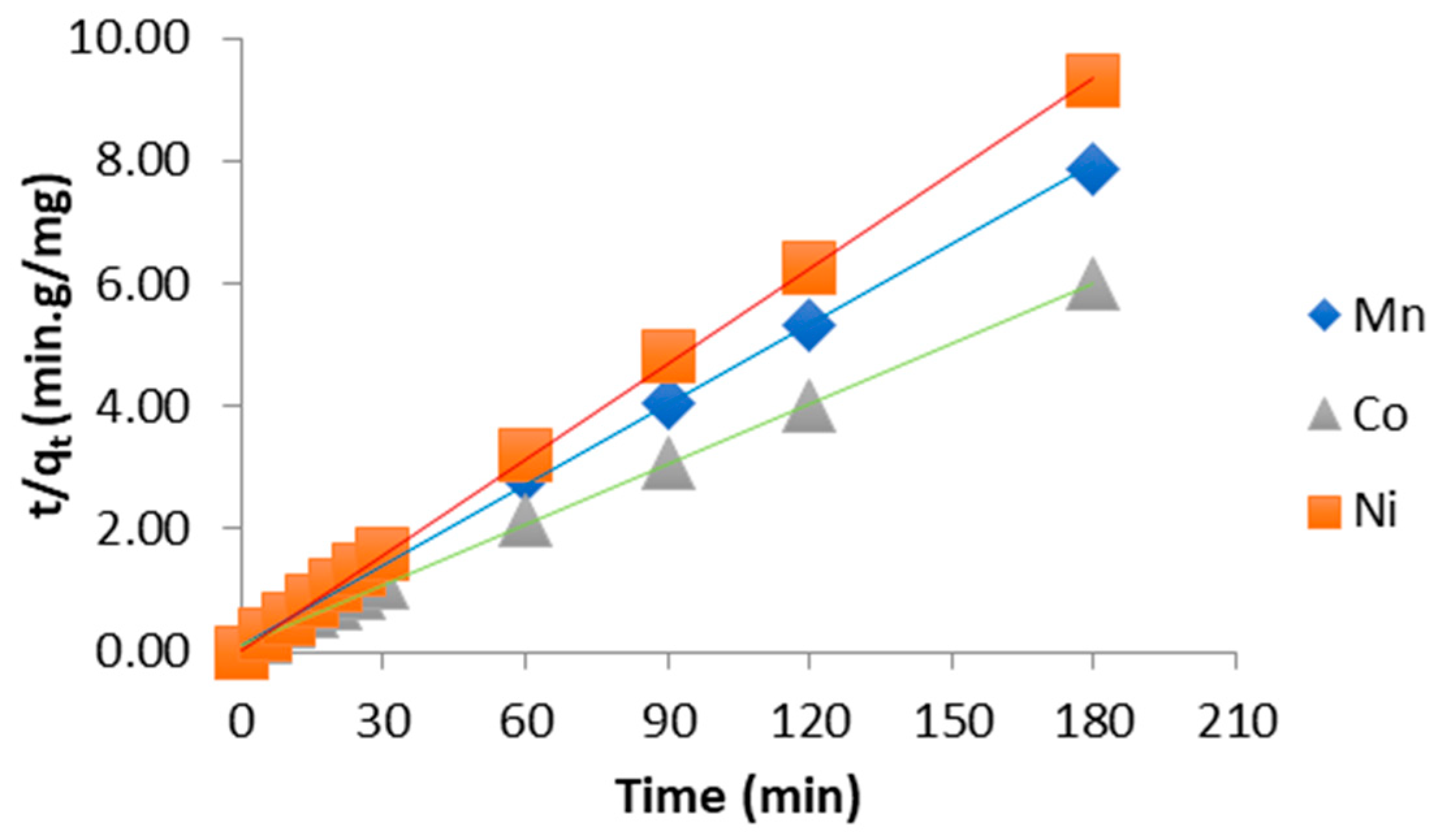 Figure 2 illustrates the evolution of the amounts of metals adsorbed as a function of the contact time between chitosan and the aqueous solutions containing Mn(II), Ni(II), and Co(II) ions. The adsorption kinetics exhibited similar trends, characterized by a rapid uptake of metal ions during the initial minutes of contact, followed by a slower increase until equilibrium was reached. This rapid initial phase can be attributed to the large number of available active sites on the chitosan surface at the beginning of the process, which gradually become saturated over time [