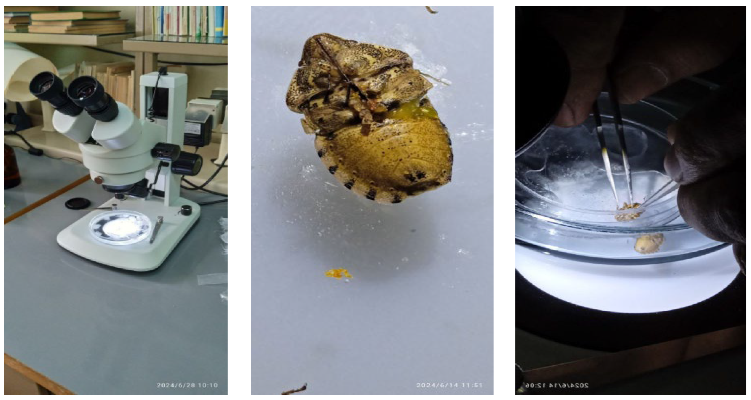 To prevent premature release of glandular contents, approximately 50 adult stink bugs were individually frozen prior to dissection. The insects were then fixed dorsally in Petri dishes and dissected under a stereomicroscope. Dissection involved a longitudinal incision along the dorsal abdominal margin extending to the metathoracic region and beneath the scutellum. The dorsal cuticle was gently lifted, and internal organs were removed with fine surgical scissors to expose the metathoracic glands (