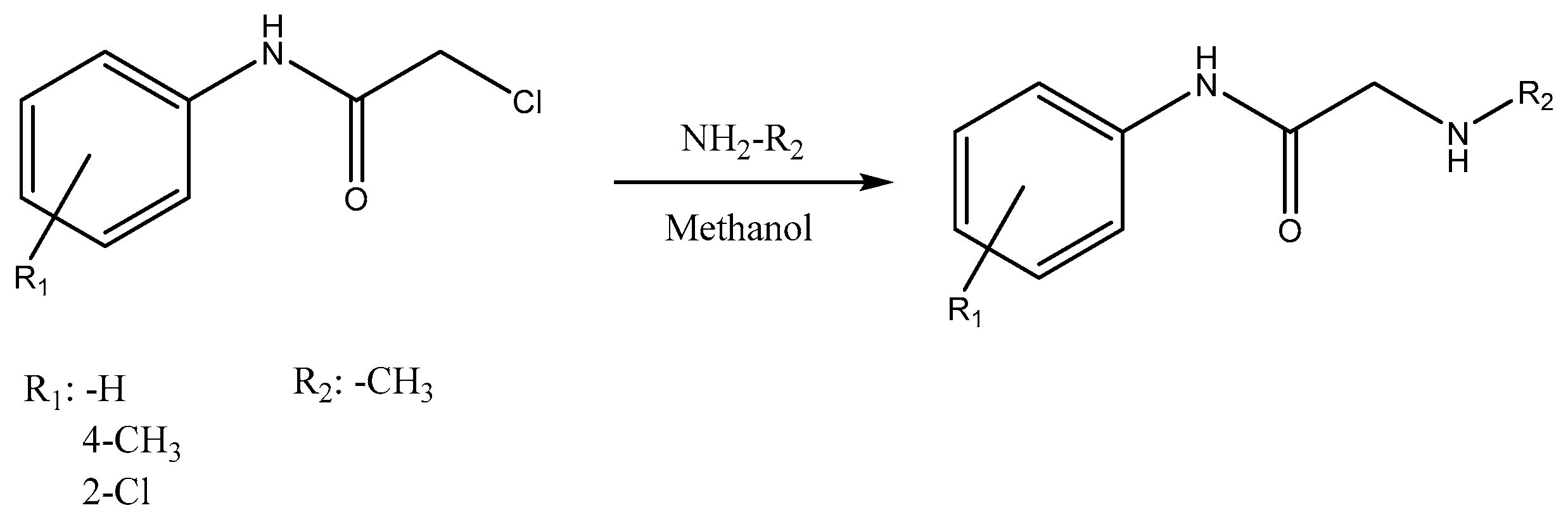 The compounds initially synthesised in this work were 2-chloro-N-phenylacetamide, 2-chloro-N-(p-tolyl)acetamide, and 2-chloro-N-(o-chlorophenyl)acetamide, which, upon reaction with methylamine, furnished 2-(methylamino)-N-phenylacetamide, 2-(methylamino)-N-(p-tolyl)acetamide, and 2-(methylamino)-N-(o-chlorophenyl)acetamide, respectively.