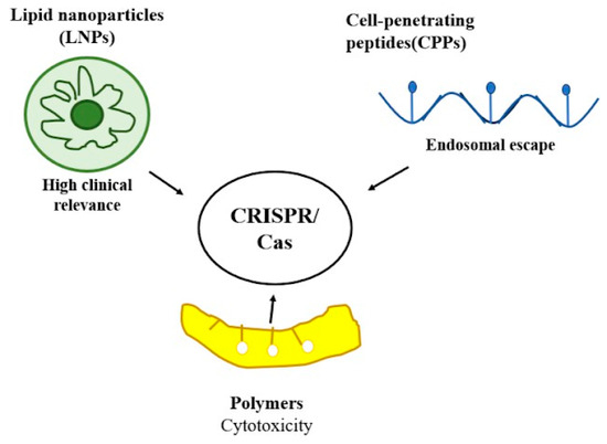 Biodegradable and cationic polymers have been extensively investigated as non-viral nanocarriers for CRISPR/Cas delivery. Poly(lactic-co-glycolic) (PLGA) nanoparticles provide tunability of degradability and biocompatibility, and have been demonstrated to improve the efficiency of homology-directed repair (HDR) in genome editing [20]. Polyethylenimine (PEI), a cationic polymer, provides strong nucleic acid condensation and effective endosomal release, but high-molecular-weight versions have high cytotoxicity; low-molecular-weight or modified PEI derivatives enhance safety. Chitosan, a natural polysaccharide, provides pH-responsive nucleic acid release and excellent biocompatibility. Conjugation chemistries such as disulfide linkages, PEGylation, and incorporation of targeting ligands further enhance polymer-based systems by allowing stability, circulation, and site-specific delivery [21]. Although promising preclinical results have been reported, optimization is still required to optimize delivery efficiency over cytotoxicity.