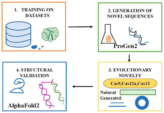 Generative protein language models (LMs), trained on extensive protein datasets, can create new CRISPR-Cas proteins by understanding natural evolutionary pressures. By adapting these models to the CRISPR–Cas Atlas (which comprises over 1.2 million operons from microbial genomes, including 389,000 individual effectors like Cas9, Cas12a, and Cas13), researchers increased Cas protein variety beyond natural resources such as UniProt. Utilizing ProGen2-based LM, approximately 4 million novel Cas protein sequences were created, signifying a 4.8-fold rise in sequence diversity. For the Cas9, Cas12a, and Cas13 families, the diversity increased by 4.1×, 6.7×, and 7.1×, respectively. The generated sequences often exhibited 40–60% identity to natural proteins, simulating evolutionary novelty. To verify performance, AlphaFold2 forecasted structures for 2000 generated sequences, with over 81% exhibiting high-confidence folds (pLDDT > 80) akin to natural proteins. This suggests that generative AI can both investigate new Cas variants and direct design towards particular families (e.g., Cas9) with little input, like in Figure 3 [25].