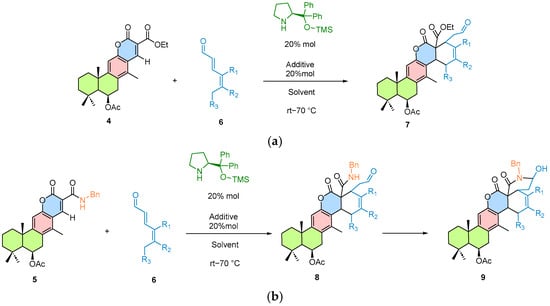 (a) Cascade organocatalytic strategy for the semi-synthesis of compound 7 from derivative 5 and dienals via trienamine activation mode. (b) Diels–Alder [4 + 2] cycloaddition between compounds 4 and 6 to afford product 8 through an organocatalytic strategy based on trienamine activation. The chiral Hayashi–Jørgensen organocatalyst is highlighted in green and the cycloaddition product is indicated in blue.