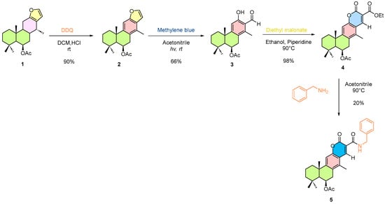 Semi-synthetic pathway of 6β-acetoxyvouacapane. Compounds 1–5 are numbered sequentially; colored rings indicate the regions of the vouacapane skeleton undergoing modification. Reaction conditions are shown above the arrows.